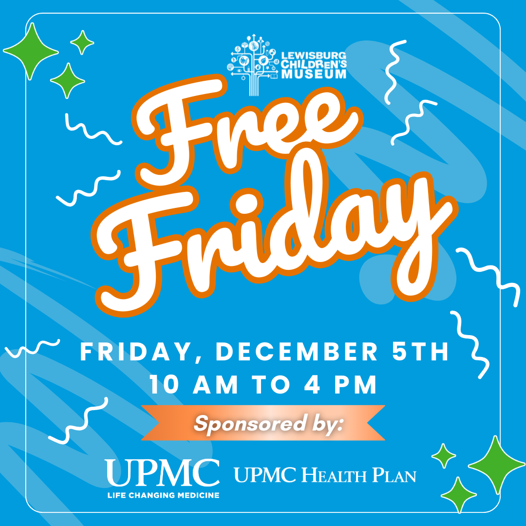 | Details: | Free Friday is back at the Lewisburg Children’s Museum! Join us on Friday, December 5 from 10:00 AM to 4:00 PM for a full day of free admission for all, made possible through the generous support of UPMC and UPMC Health Plan. We are excited to welcome the CEO of UPMC, who will be visiting the museum along with his friends Will and Gabby. Be sure to stop by and say hello during your visit. A special Storytime with UPMC will take place at 11:00 AM. Guests can explore many of our most popular exhibits, including:
