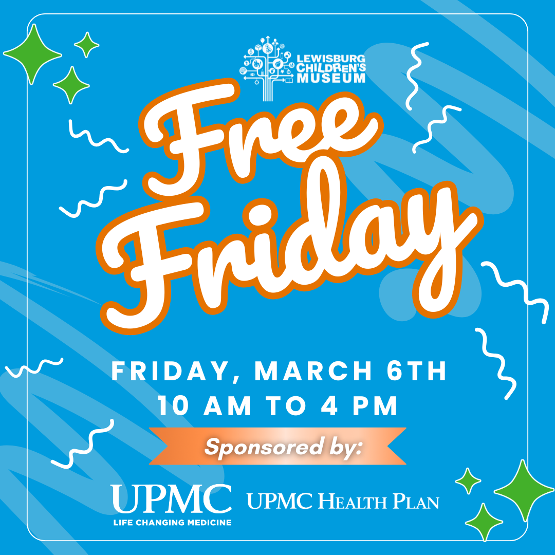| Details: | Free FridayFriday, March 6 | 10 AM to 4 PM Enjoy a full day of learning, creativity, and play at the Lewisburg Children’s Museum—completely free. Free Friday invites families to explore hands-on exhibits, imaginative play spaces, and interactive learning experiences at no cost. This special day is made possible thanks to the generous support of UPMC and UPMC Health Plan. A special storytime with Will and Gabby from UPMC will take place at 11:00 AM, offering a fun and engaging moment for little listeners during your visit. Free admission for all visitors. No registration required. |